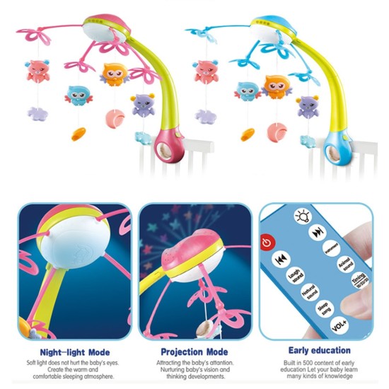 Safety First: Crafted from premium materials, our bed bell is safe and non-toxic, ensuring your baby's well-being. Soothing Night Light: Ease your baby into quiet times and naptime with a soft, gentle night light that creates a calming atmosphere. Musical Marvel: Our mobile's music box offers a delightful selection of 500 melodic tunes, including 3 laughter tracks, 3 instrumentals, 2 soothing natural sound effects, and 8 charming animal sounds. Interactive Fun: The cute, rotatable animals are more than just decorations – they can be detached and transformed into individual toys. These captivating toys are designed to engage your baby's attention and help improve their eye coordination. User-Friendly: Featuring a touch remote control and a projector night light function, our bed bell not only promotes your baby's hearing development but also enhances their sound recognition skills. Material: High-quality Plastic Dimensions: 45 x 48 x 53 cm Power Source: Requires 3 x AAA batteries (not included)