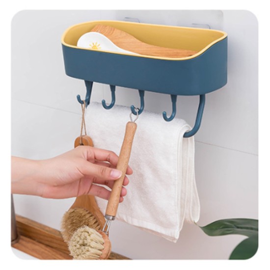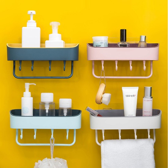 - Storage Shelves - Wall-mount sticking bathroom shelf with towel bar and hooks.